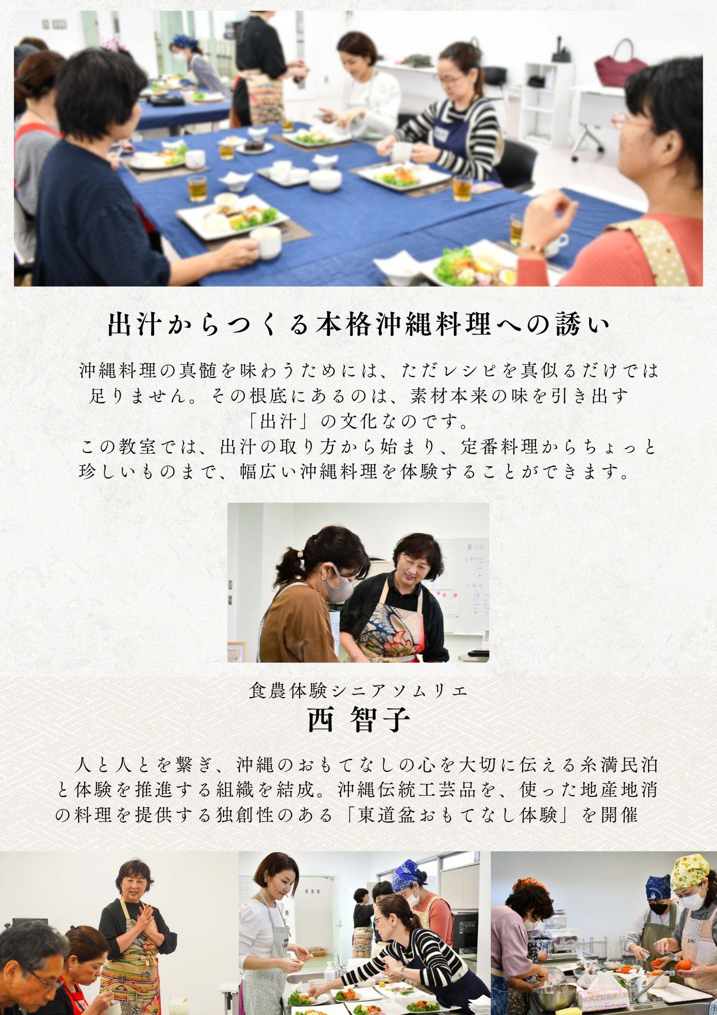 この教室は出汁の取り方から始まり、定番のクーブイリチーやジューシー、スーチカーなど幅広い沖縄料理を体験することができます。